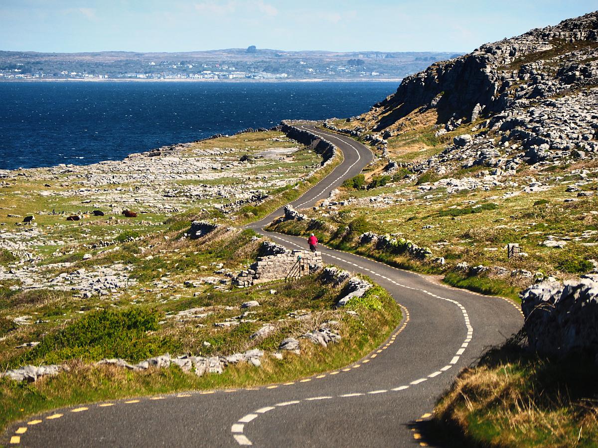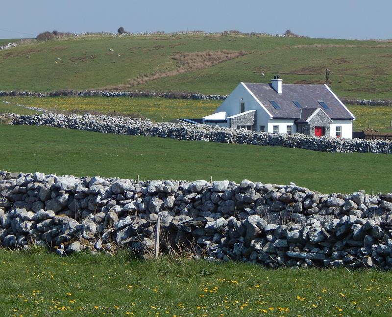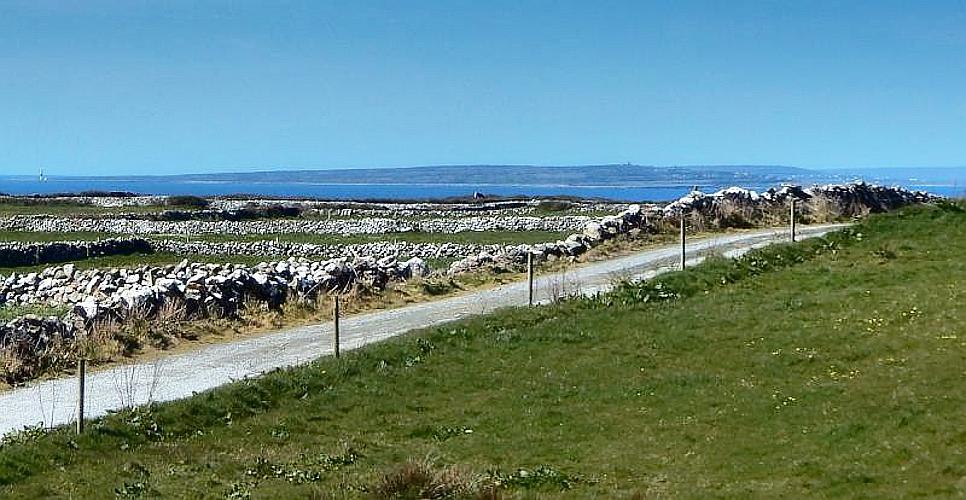 Die Aran Islands sind eine Verlängerung der Burren-Landschaft Richtung Westen. Der Besuch der Inseln gehört zum unvergesslichen Pflichtprogramm eines jeden Besuchers. Boote fahren mehrmals täglich vom Pier aus die drei Inseln an, die nicht nur durch Steinzeitforts sondern auch durch die dort handgefertigten Pullover zu Berühmtheit gelangt sind. Die Inselbewohner, die noch Irisch sprechen, bestritten traditionell ihren Lebensunterhalt durch Fischfang. Während die Männer fischen waren, strickten die Frauen die traditionellen 'Aran Ganseys'. Jede der Inseln, Inis Oírr, Inis Meain und die größte, Inis Mór, hat ihren eigenen Charakter und eignet sich besonders zum Wandern und Biken. Sie finden dort alte Festungen, Kirchen, endlose Steinmauern und Denkmäler. Das Bild unten zeigt den Blick, den Sie von unserem Haus in Richtung der Aran-Inseln haben.
