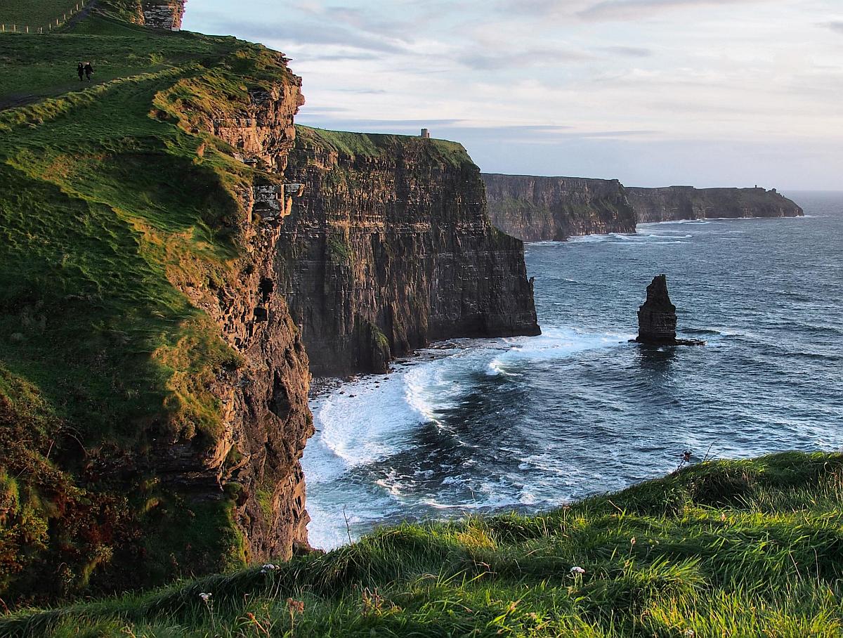 Die berühmten Cliffs of Moher sind über 200 Meter hoch und bieten den Besuchern einen hohen Aussichtspunkt über die Galway Bay und die Aran-Inseln.Der O'Brien Tower befindet sich am Nordende, das Moher Castle am südlichen Ende. Die Klippen sind die Heimat zahlreicher Seevögel - ein Paradies für Vogelbeobachter. Ein beliebter, spannender Wanderweg erstreckt sich entlang der Klippen zwischen Doolin und Liscannor.